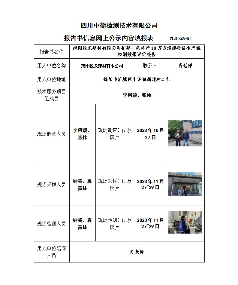 綿陽銳龍建材有限公司擴建一條年產(chǎn)20萬方濕拌砂漿生產(chǎn)線控制效果評價報告