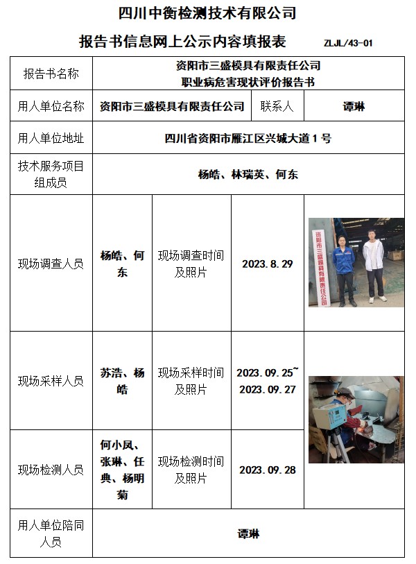 資陽市三盛模具有限責(zé)任公司 職業(yè)病危害現(xiàn)狀評(píng)價(jià)報(bào)告書