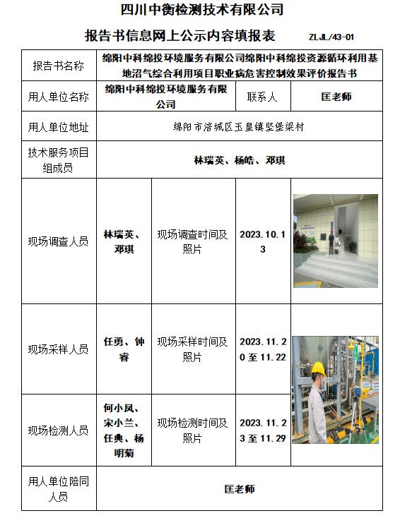 綿陽中科綿投環(huán)境服務(wù)有限公司綿陽中科綿投資源循環(huán)利用基地沼氣綜合利用項目職業(yè)病危害控制效果評價報告書
