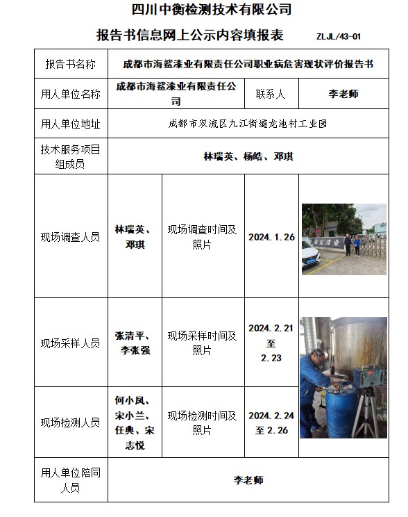 成都市海鯊漆業(yè)有限責(zé)任公司職業(yè)病危害現(xiàn)狀評(píng)價(jià)報(bào)告書