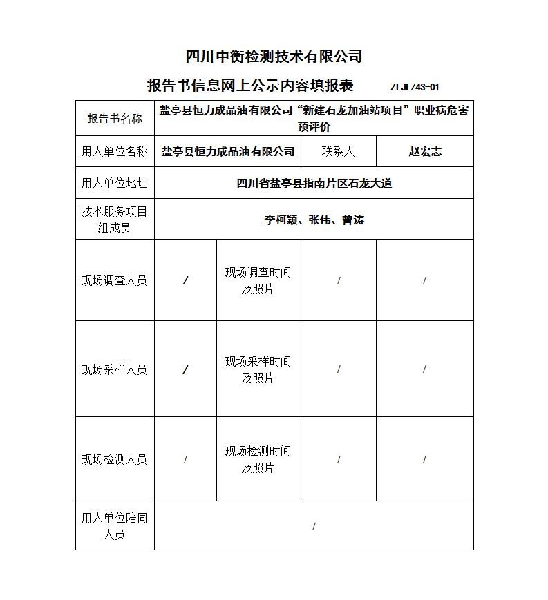 鹽亭縣恒力成品油有限公司“新建石龍加油站項目”職業(yè)病危害預評價