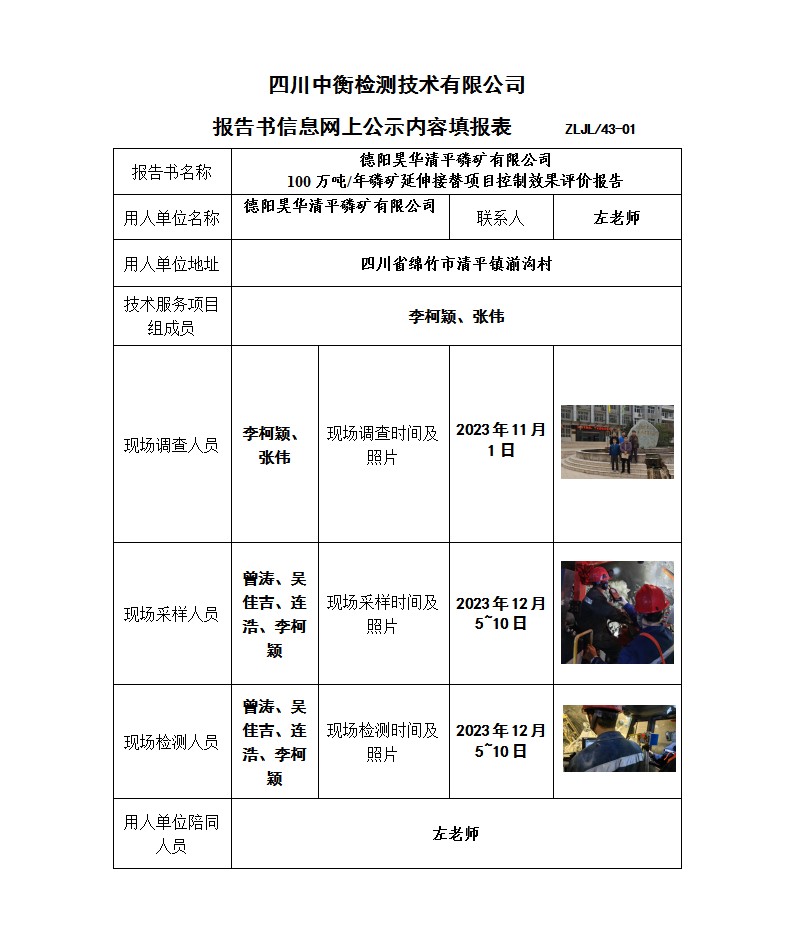 德陽(yáng)昊華清平磷礦有限公司 100萬(wàn)噸/年磷礦延伸接替項(xiàng)目 職業(yè)病危害控制效果評(píng)價(jià)報(bào)告書(shū)