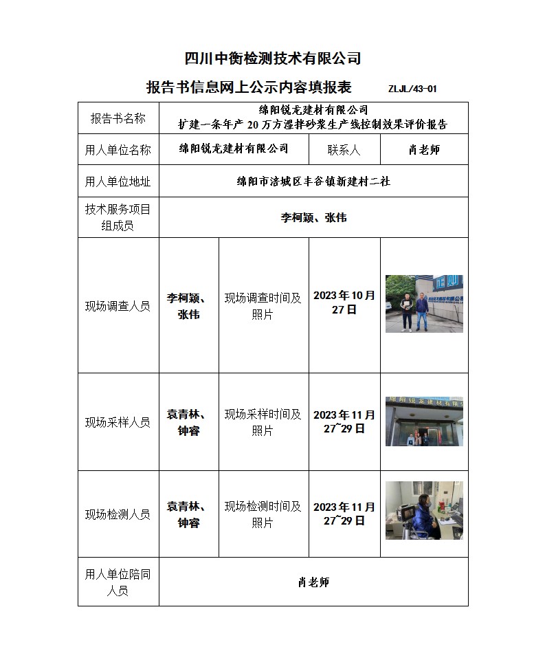 綿陽銳龍建材有限公司 擴(kuò)建一條年產(chǎn)20萬方濕拌砂漿生產(chǎn)線 職業(yè)病危害控制效果評(píng)價(jià)報(bào)告書