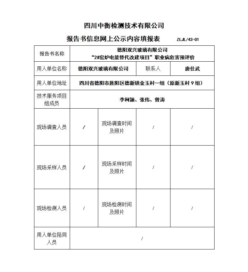 德陽雙興玻璃有限公司“2#窯爐電能替代改建項(xiàng)目”職業(yè)病危害預(yù)評(píng)價(jià)